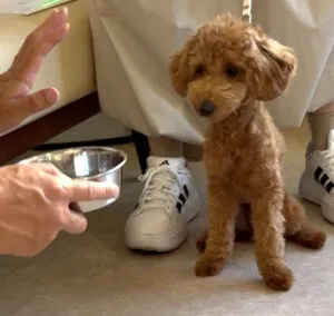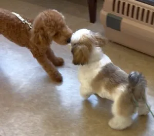 名前に反応する練習をした後、リラくん(トイプードル)と挨拶です。