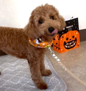 ちょっと早いですが、リラくんはハロウィンのバンダナを付けて撮影しました。もちろんリラくんが自分からバンダナを被りに来る方法を使いました。落ち着く練習をしてきたマイマットを使うと、たくさん可愛い写真が撮れました。リラくんも飼い主さんもとっても楽しそうでした。