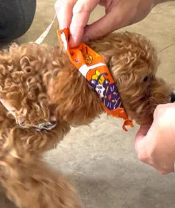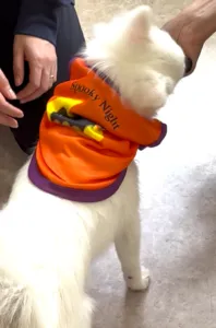 こはるちゃんはハロウィンのバンダナを付けています。誘導しながらスムーズに装着できました