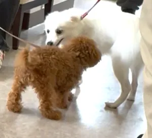 初めて見る置物に近づいて行くこはるちゃん(トイプードル)。ワンちゃんは自分と同じ高さで、目の付いた物を見ると慎重になる場合が多いです。この時の気持ちは、体の動き(近づくスピードと重心のかけ方)を見て推測します。ゆっくり進んで、重心が後ろにあるので、やや警戒という感じ。