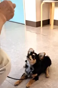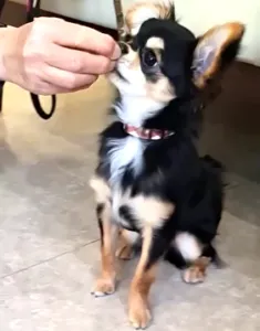 イゴくんは元気なチワワです。オスワリ練習の成果を見せていただくと、座るのは一瞬で、お尻が浮き上がることが多いようです。座った後にゴホウビをあげる角度に注意すると、きれいなオスワリを保つことが出来ました。初めに正確に教えておくと、今後スムーズに応用できます。