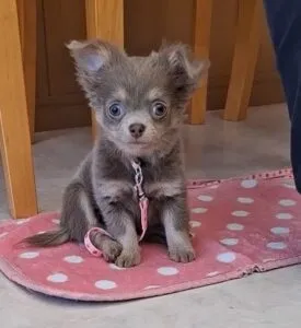 抱っこしてもらうと手の中に入るサイズです。小さい子ほど密着して抱っこできるようになっておくと、さまざまなケアがスムーズになります。デールくんは首輪・リードを付けるのは二回目だったようです。