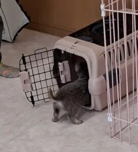 布製のキャリーバッグはお持ちなので、今日はハードタイプのクレートに入る練習をしましょう。食べ物を入れたオモチャが大好きになったので、つられてクレートの中へ喜んで入っていきました。複数飼育され、活発な子犬の場合はクレートは必須アイテム。そして幼い時期なら直ぐに入れる子犬もいますね。