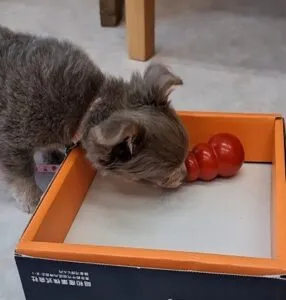 食べ物とオモチャが好きな子は、コングでの食事がお勧めです。可愛い子犬にも狩猟本能があるので、人の手をじゃれ咬みされて悩むよりも、食べ物を入れられるオモチャを使いましょう。そしてオモチャが転がっていかないように箱に入れるのも良いでしょう。