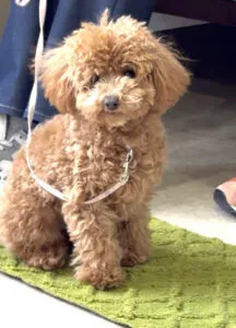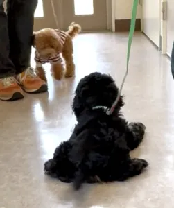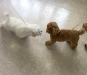 待合室でのクラス一部目は、犬種も性質も月齢も違った3頭が参加されました。こはるちゃん(トイプードル)は、本日修了回です。