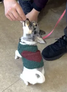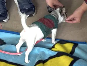 よつばちゃんは診察室への入り口で躊躇してしまい、前進できないことが発覚。持参された毛布を敷くと入室可能に用心深い子犬は足の裏に触れた感覚を大切にしています。室内用と外出用に、お気に入りの敷物を準備しておきましょう。