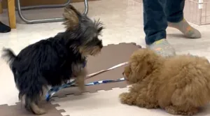 その後、トイプードルのハナちゃんヨークシャテリアのトラくんが合流。グループレッスンが始まります。