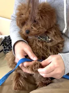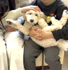 コアくんは良く動くワンちゃんですが、抱っこは大好き。とても良いことですね。今日はお手入れに向けて身体を触る練習もしました。
