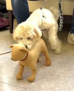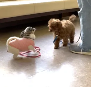 ジャックくん(トイプードル)は体調が整ったので初めて参加されましたが、月齢が進んで社会化期が終わり、警戒心が出て来る時期に入っています。先ずは犬のぬいぐるみとの挨拶体験をしてから、ワンちゃんに近づく練習をしました。子犬は4か月齢までは好奇心が旺盛で、その後は警戒心が増えて行きます。