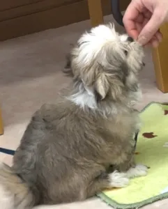 ティムくんはオスワリが上手になっています今日はレベルアップとして食べ物を持たないで、合図を教えていきました。順序立てて教えれば、子犬は柔軟な頭で驚くほど学習して行きます。
