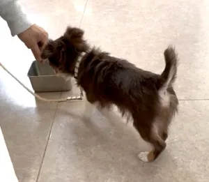 病院でよく使うステンレスの食器は光の反射があったり、リードの金具が当たって音がしたりでなかなか近づけません。いろいろなタイプの食器にも慣らしておきましょう。