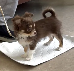チワワのシェリーちゃんマットを敷くと自分から乗ることが増えましたね。指示ではなく、自発的な行動を褒めることでの学習もさせていきます。マットは自分の居場所として安心できるように、警戒心が出てくる月齢までにしっかり馴じませておきましょう。