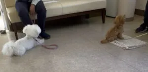 子犬の時期のパピークラスであれば、互いに嗅ぎ合う時間を作っています。トイプードル同士でご挨拶。リラちゃんクルミちゃんです。こうして遊ぶ場面はとても微笑ましいので、『ドッグランに連れて行かなきゃ』と思われる方もおられますが、そこには色々な年齢、性質の犬が居ることでしょう。