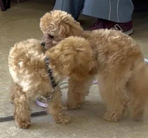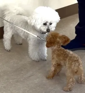 子犬の時期のパピークラスであれば、互いに嗅ぎ合う時間を作っています。トイプードル同士でご挨拶。リラちゃんクルミちゃんです。こうして遊ぶ場面はとても微笑ましいので、『ドッグランに連れて行かなきゃ』と思われる方もおられますが、そこには色々な年齢、性質の犬が居ることでしょう。